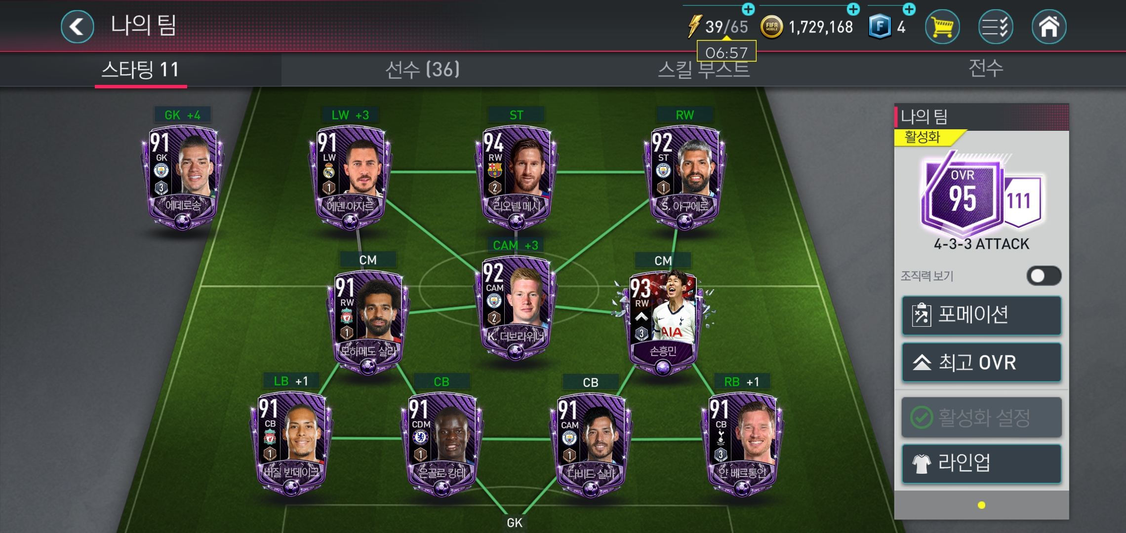 그러나 점점 늘어나는 공격형 선수들을 버리고 갈 수 없어 중앙에 두었다. 케빈 데 브라이너가 있어 중심을 잡아주니 나름 괜찮은 조합이다. 게다가 기회만 있으면 손흥민과 모하메드 살라도 상대 수비를 헤집을 능력이 되고, 득점에도 기여하는 바가 크다. 패스 플레이를 하기에는 좀 부족한 면이 있지만, 공격으로 득점을 내어 이기는게 목표기 때문에 이렇게 배치했다.